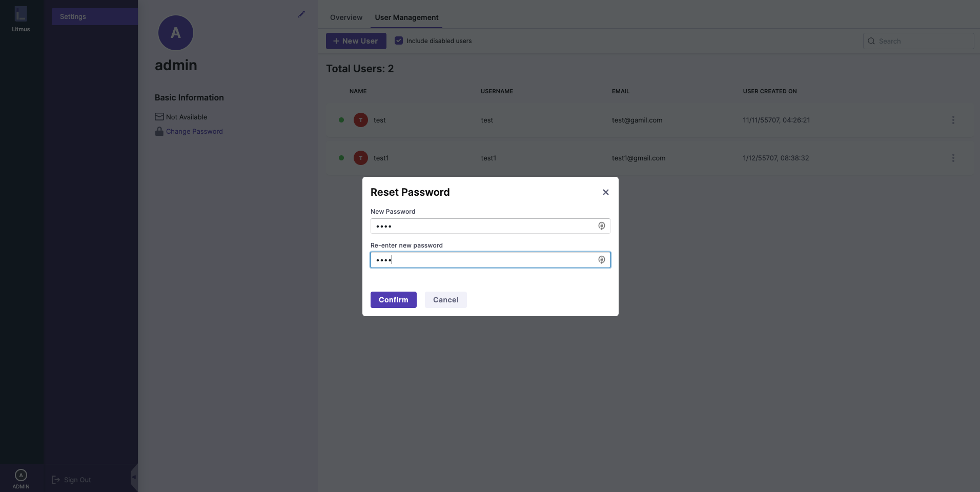 In the Reset Password modal type in the new password in the New Password & Re-enter new password fields. Once done hit the Confirm button to update the password.