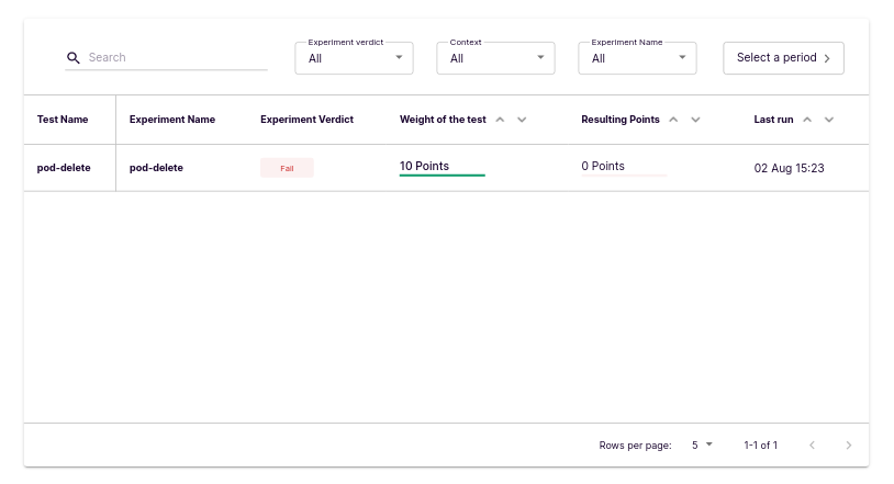 On clicking on a bar, more details about the chaos scenario run represented by that stacked bar are presented in a tabular format. A table having individual experiments details is presented to the user, which helps them to get insights about the experiments.