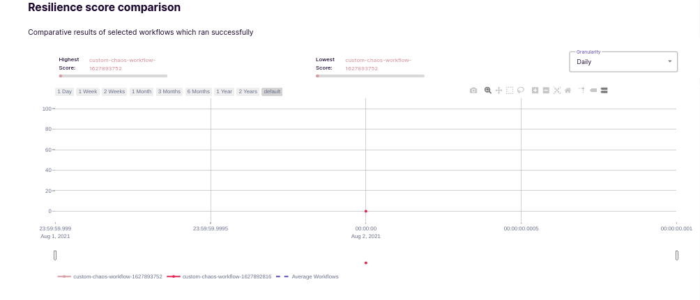By hovering over the dots on comparison graph, you can see the resiliency score of compared chaos scenarios & also average chaos scenarios.